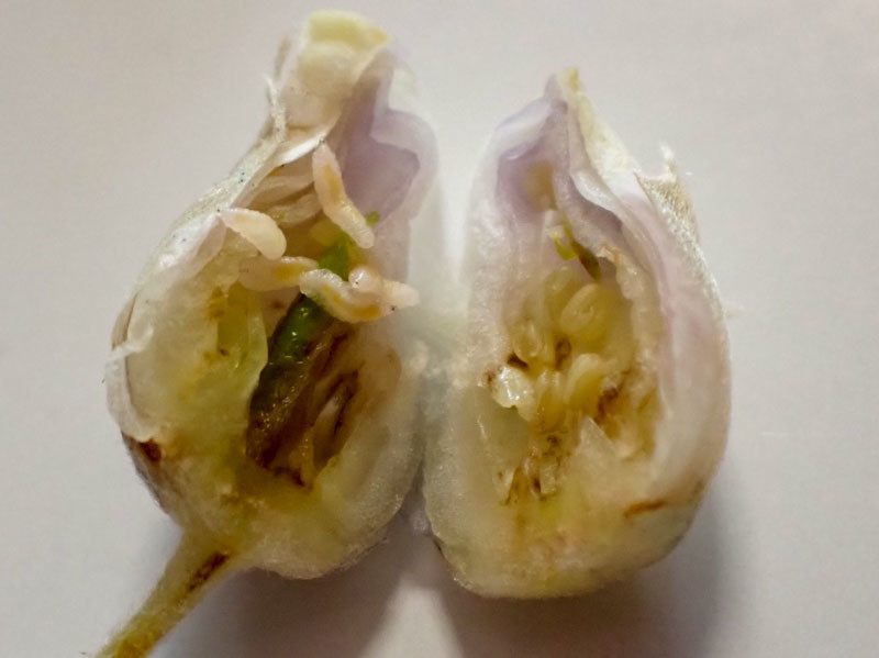 2022-04-23 フジツボミフクレフシ 気になっていたフジの大きさの違う蕾、正体がわかりました。 大きめの白い蕾に見えるのは「フジツボミフクレフシ」。触れると落ちやすいです。 フジツボミタマバエが作る虫こぶでした。 普通の花と違って中には幼虫が(見るの注意!) 花が終わると蕾ごと地面に落ち、幼虫は地面に潜って翌春蛹となり、羽化して成虫がまたフジの蕾に産卵。フジの名所では、害虫として防除。 fujitama3.hatenadiary.jp