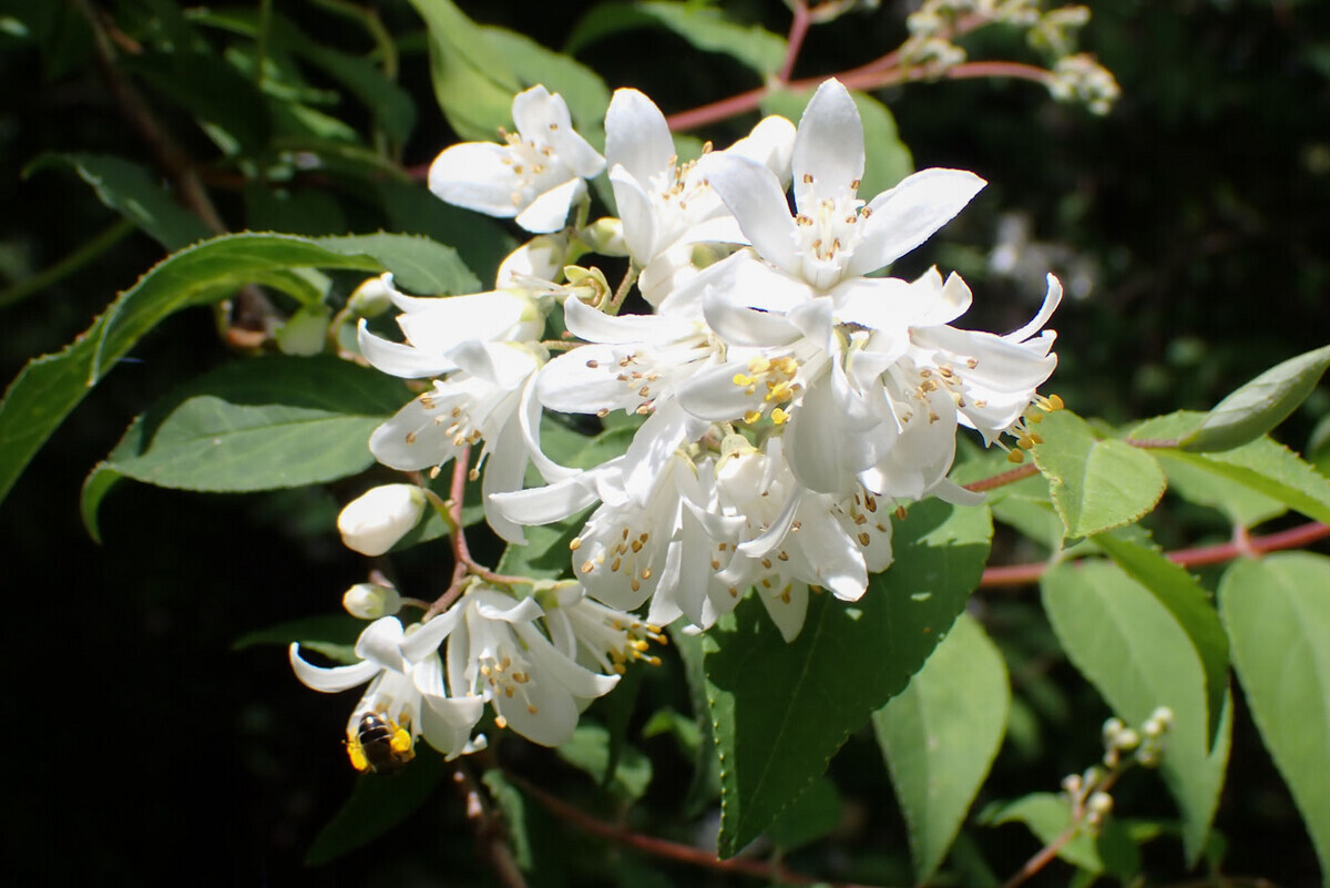 2024-05-26 初夏の花9 つぎつぎと咲く花が移ろう。 イワガラミ、 ウツギ、 イヌツゲ、 リョウブ。 イイギリは見えないくらい高いところに咲いている花が落ちて、少し香る。 下向きに咲いていたサラサドウダンの実が上向いてつく。 この前まで黄色い花を咲かせていたジャケツイバラが大きな莢をつけ、 ドクウツギの実が赤くなる。 キハダの木には、ハートマークのエサキモンキツノカメムシ。 #筑波実験植物園 fujitama3.hatenadiary.jp